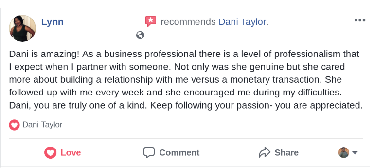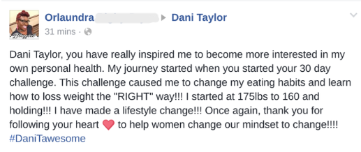 Dani Taylor, you have really inspired me to become more interested in my own personal health. My journey started when you started your 30-day challenge. This challenge helped me change my eating habits and learn how to lose weight the "RIGHT" way!!! Once again, thank you for following your heart to help women change our mindset to change our health!!!