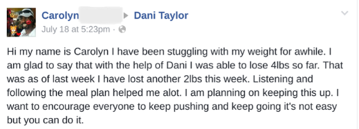 I followed the plan that Dani set for me and it was easier than I thought. I cut out foods and drinks that I thought I couldn't live without. I lost inches and pounds by being obedient to what she was asking me to do, even though I had a hectic work schedule. I would recommend her to anyone wanting to lose weight or even just gain energy. Dani Taylor is AWESOME!!!!!!!!