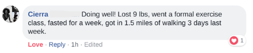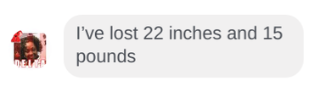 “When we started, I had two goals. 1) Alleviate the migraines. 2) Start eating healthier. I was struggling with severe migraines and was experiencing at least 2 a month. The weekly check-ins helped me stay on track and hit my goals. I still have headaches, but they are not as severe and they don’t last as long. I have started drinking a lot more water, and I have transitioned to a pescatarian diet. Be open to the process. The accountability really helps you stay on track. If you are willing to make small, consistent changes and trust the process, you can see real improvements.”