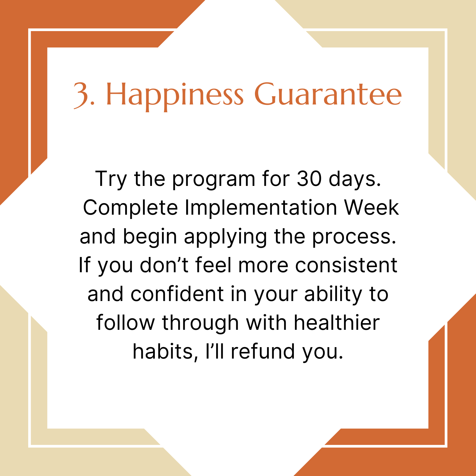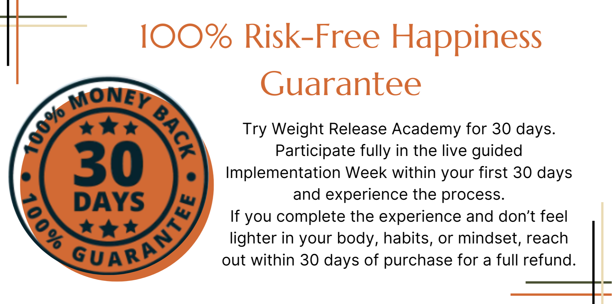 However, I want you to be 100% comfortable with your decision to join Weight Release Academy so if you participate fully in the live, guided Implementation Week within 30 days of purchasing and if you don't feel lighter in your body, habits, or mindset, I’ll refund you.